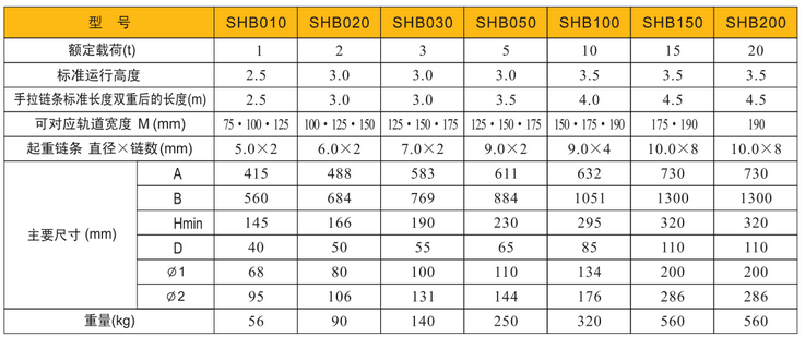 成華低凈空手拉葫蘆包括SHB010、SHB020、SHB030、SHB050、SHB040、SHB100、SHB150、SHB200等型號(hào)。這些型號(hào)的葫蘆分別對(duì)應(yīng)著不同的額定載荷,并且它們的額定載荷不同也導(dǎo)致了它們?cè)谝韵聨讉€(gè)方面的不同。